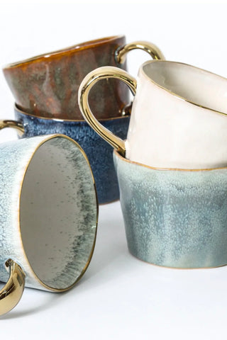 Our exclusive range of beautiful Ariel mugs has amassed a loyal cult following and continues to sell out time and again. They have been handmade and glazed in a reactive glaze in 5 different colours and gilded with gold around the rim and the handle. They are always a favourite amongst the Few and Far team and make the most perfect gift for someone you love.