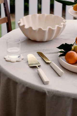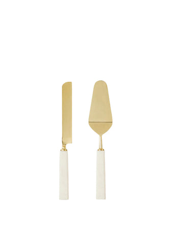 Presenting the elegant Aries Cake Server Set, showcasing a timeless cream resin handle complemented by brass utensils. Delicately packaged in a white gift box, it's the perfect blend of sophistication and practicality for any occasion.