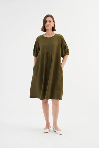 Discover effortless elegance with the Bishop Sleeve Shirring Dress. Crafted from 100% French linen, this dress showcases intricate shirring details on the back and sleeves, adding a beautifully textured finish. The gathered front and flowing bishop sleeves enhance its refined silhouette, making it a versatile piece that transitions seamlessly from day to night with the practicality of pockets.