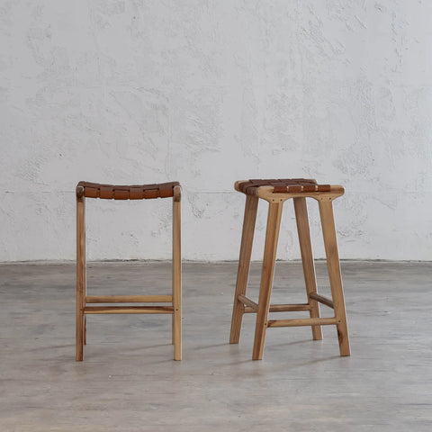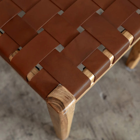 Calixta bar stool has a seat height of 67cm and is constructed from brown hand-braided leather straps and a structure made from solid teak timber. Due to being made of natural materials, each stool has its own tones and textures making each piece exclusive and unrepeatable.