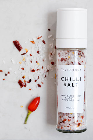 Our TASTEOLOGY Chilli Salt has a base of Great Barrier Reef white rock salt, which has been carefully mixed in with birds eye dried chilli flakes to create a hot chili salt for the true Chilli lover.