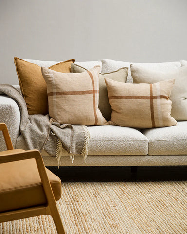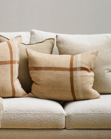 The Clintock cushion presents the Cottage core aesthetic in its most minimal form. Offset plaids in comforting warm tones paired with natural fibres reference rural escapism. Comfort and quality go hand-in-hand, as core items become covetable new classics.