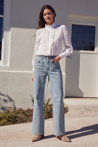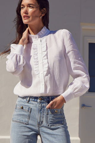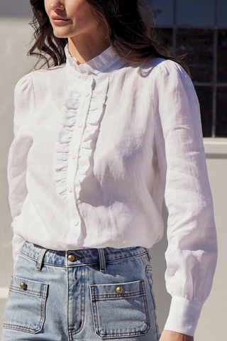Ethereal yet everyday, the Dialect Top is crafted from lightweight ramie, blending softness with structure. A curved ruffle neckline and delicate ruffle details along the bodice offer just the right amount of femininity, while contrasting shell buttons introduce subtle texture. see product details below.