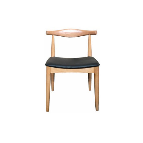 The Elbow Chair has a natural beechwood frame with a black padded seat.