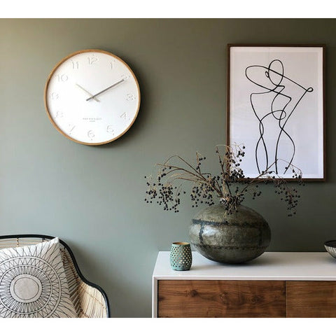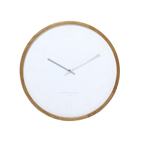 The Freya wall clock by One Six Eight London boasts a simple face that creates a sleek, stylish backdrop for stamped Arabic numbers and polished hands.