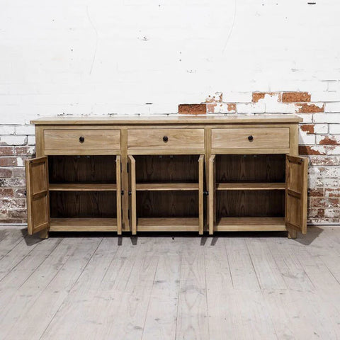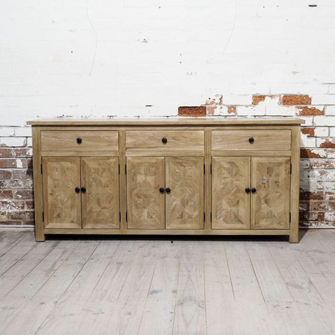 The Kensington Buffet features a parquetry table top and elm timber. It features three drawers and six cupboard doors, therefore loads of storage.