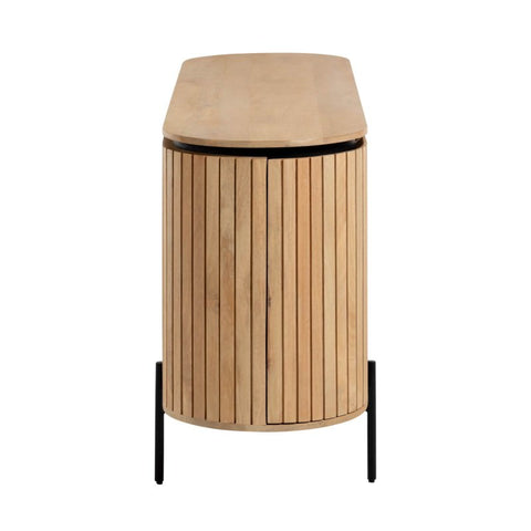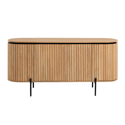 Licia sideboard is constructed from mango wood with pieces placed one-by-one that give it its shape and design. It has also been lacquered to brighten the colour of each piece polished and moulded by hand. The metal legs and details are painted with a matte black finish and have been left exposed following the trend of open structures and leaving space to be able to open the doors without needing handles. If you are looking for originality wait until you see how its doors open at the sides!