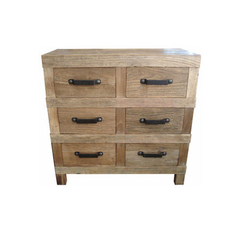 This recycled timber product is made from old houses and building materials. Due to the nature of recycled timber the product will come with some natural imperfections. It is this type of timber that gives this furniture a unique and individual charm. No two pieces will ever be the same. It has iron handles and 6 drawers.