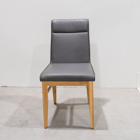 The Sienna Leather Upholstered Dining Chair is made of American Oak timber, and shown here in grey leather.