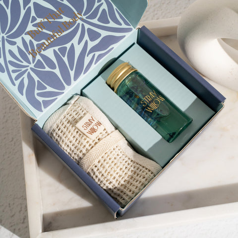 This Silk Body Kit is a gift-ready Australian-made self-care ritual featuring a mini version of our Idle Falls Body Oil and a natural exfoliating body cloth. This luxury self care bundle is crafted with nourishing botanical ingredients and pure essential oils including Grapefruit, Bergamot, Ylang Ylang, anti-inflammatory Blue Tansy, and Vanilla—designed to hydrate skin and calm the senses. Housed in sustainable glass packaging, this natural body care set creates a mindful wellness moment that transforms everyday routines. The perfect bundle for thoughtful gifting or daily self-care indulgence, ideal for those seeking natural beauty alternatives.