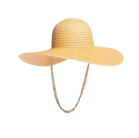 The ultimate Summer accessory and a hat you can customise. This floppy brimmed hat can go from day to early evening and comes with a matching hat chain that is detachable.