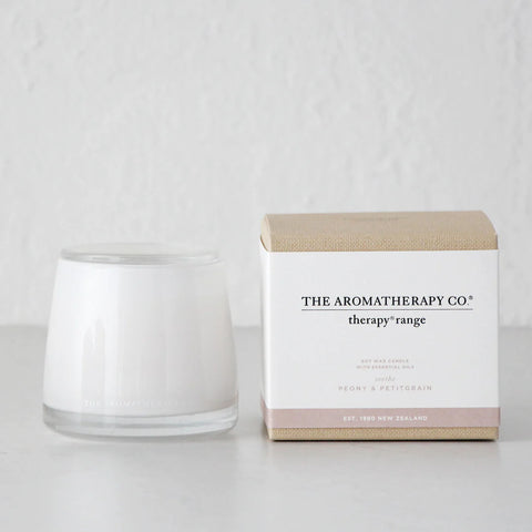 This Therapy Candle is a soy and natural wax candle made with the essential blend of Peony and Petitgrain to create a serene scent.