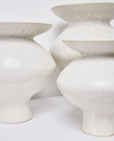 A reactive glaze makes each piece unique. The vase has a striking classical silhouette with a narrow neck and wider center, tapering in and out.