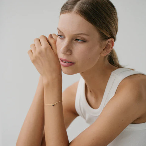 A fine chain bracelet featuring a black rectangular cut zircon pendant. Sweet on its own or layer it up.